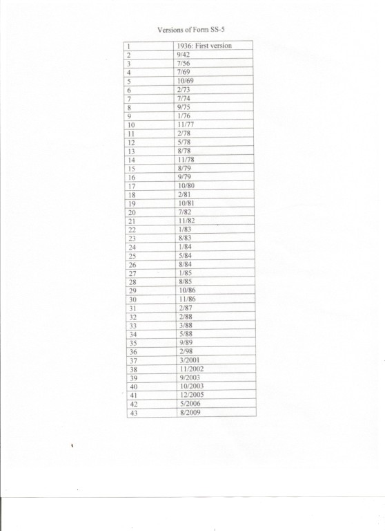 Chart received from the Social Security Administration indicating when revisions were made to Form SS-5. The year 1959 does not appear in the chart, and the form is different from others Taitz has obtained from 1959