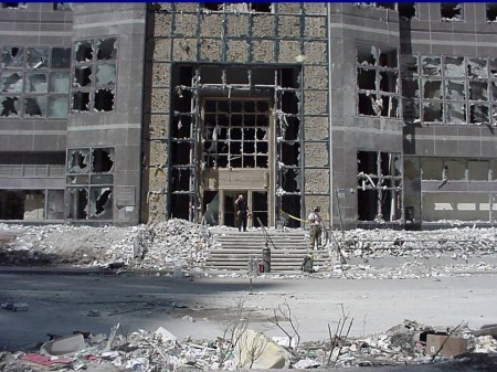 (I believe it was north) to the street that ran in front of building 7. We then tried to decided which route was the better way out. As man I was with (I never thought I would forget his name either) carefully walked out into the street to try and get a view the 2nd Tower started to come down.