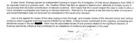 According to Dr. Robert D. Hunt of the Center for Attention & Brain Function, Ms. Wilder’s oldest son now suffers from “learning and behavioral difficulties secondary to traumatic brain syndrome. This diagnosis was independently confirmed by the evaluation of Vanderbilt Pediatric Neurology. By XXXX’s own report, much of his head trauma was due to being hit in the head by his father – who was easily and frequently provoked into violent, angry outbursts.”