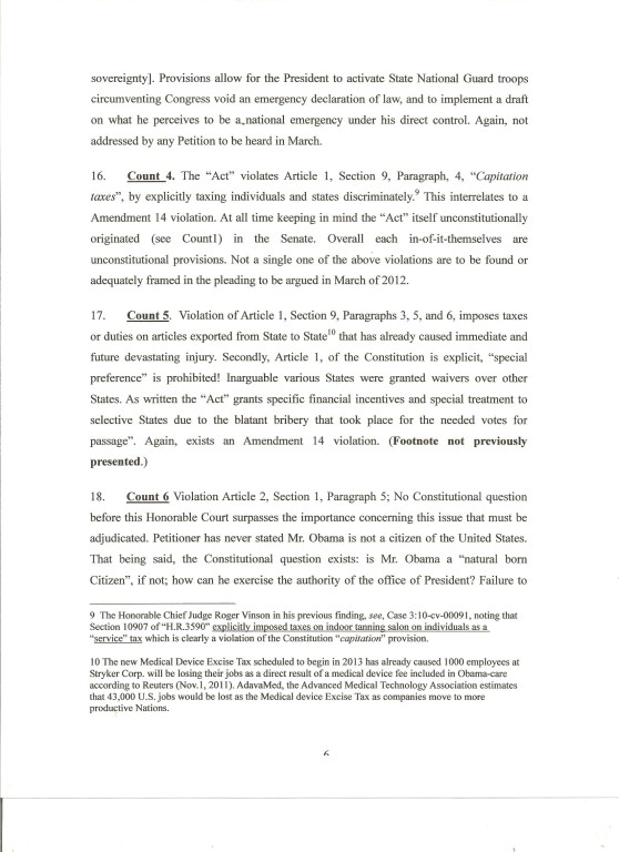 “Count 6” asks how Obama can “exercise the authority of the office of President” if he is not a “natural born Citizen”