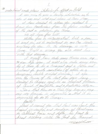 I myself have made many choices over my 38 year life span. I will also make many more. As I chose to be a criminal and a father and husband for quite some time (of which [sic] is a dangerous double minded decision) I also over the course of the last few years have decided to change and be an obedient follower of Christ. A good father and a productive citizen [sic].