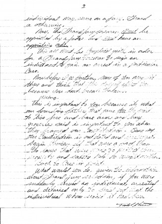 A Grand Jury is to be picked under the same laws and rules as a jury. I would quote those laws and rules but for the present I am being denied my right to freely study law books that are in existence [sic] here at the jail. (for obvious reasons) But anyway, the Grand Jury is to be formed by 36 individuals each year. Plus a jury forman [sic]. None of which can have served on ANY jury in the county for a back period of 2 years. Completely and utterly destroying any chance of any one person serving consecutive terms. No, only one year. Then they must not serve for two years, then they are then allowed to serve for one year and on and on and on.