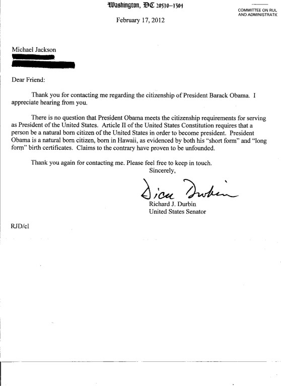 Leter received by Michael Jackson from Sen. Richard Durbin