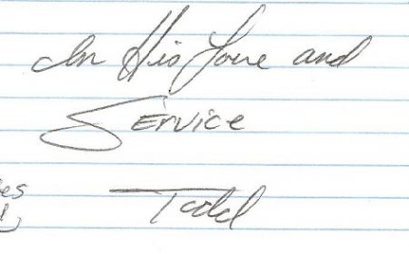 The capital “A” was circled in red pen, although the letter was written in black ink. Sweet also stated at the bottom of the letter, “Im [sic] sendin [sic] tons! Gotta build up funds for copies + postage – God’ll provide” followed by a smiley face. On the lower right is the complimentary close, “In His Love and Service, Todd.”