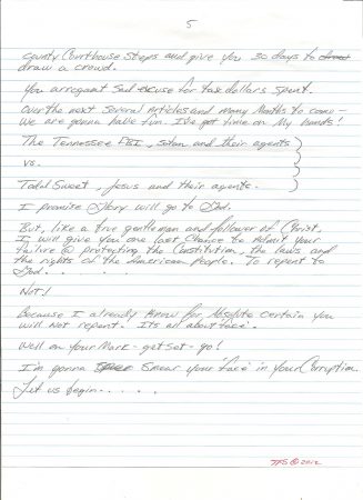 So this was the same story I got when I sat with Mike and his unidentified partner: Walt is a sovereign citizen therefore I shouldn’t associate with him. Walt is a birther so I shouldn’t . . . etc. Walt is telling tall tales so . . . etc. Walt is a martyr looking for the next drama episode, etc., etc.