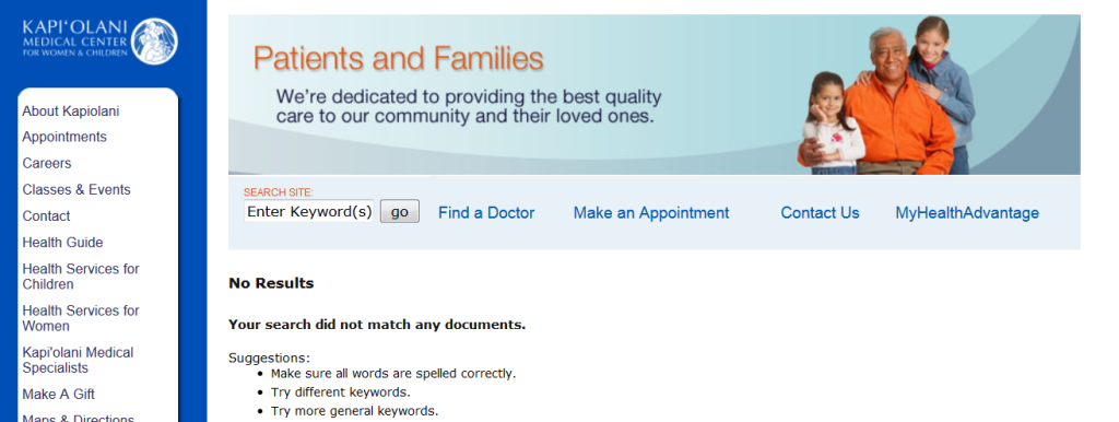 Kapiolani Obama No Results Screen shot of results using the search term “Obama” on the Kapiolani website