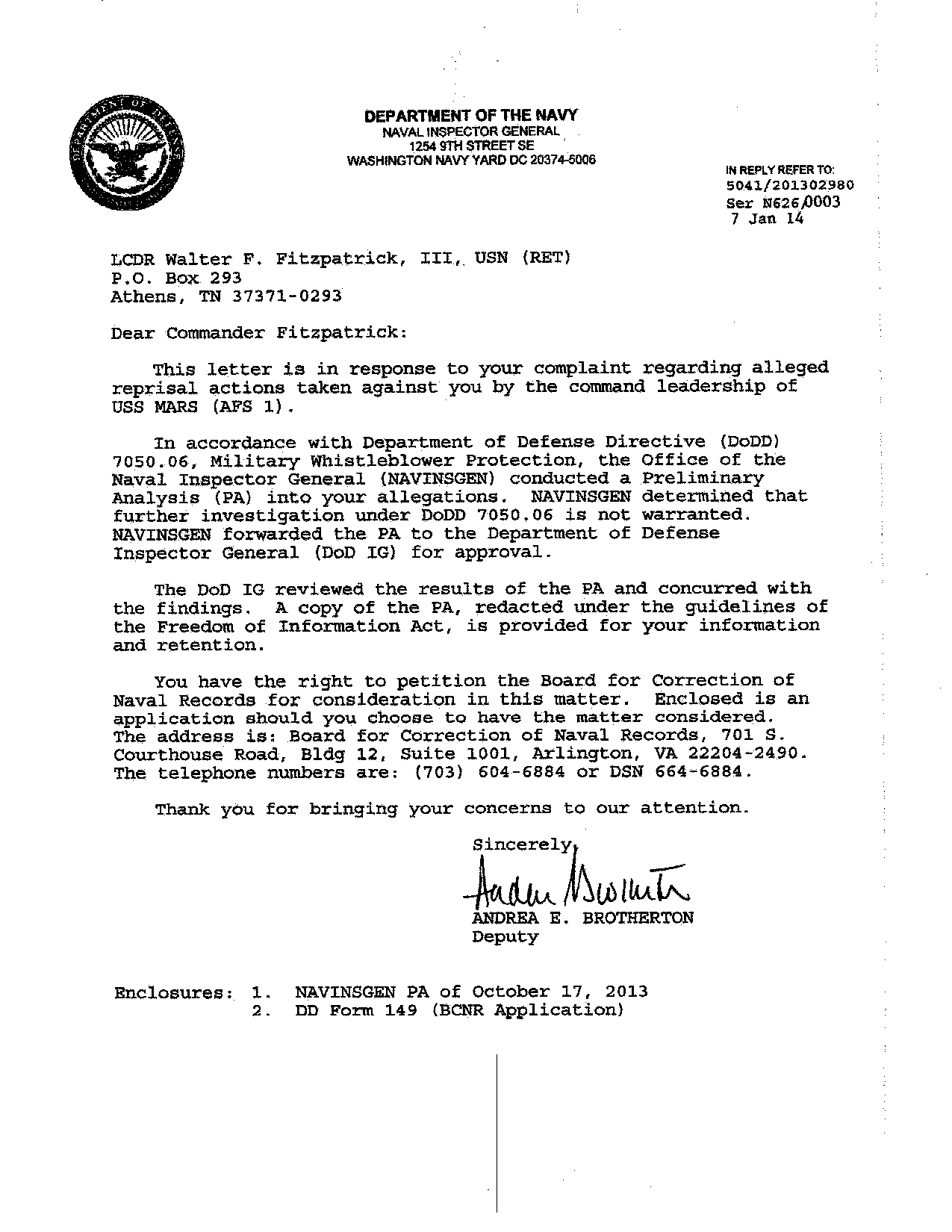 The Inspector General’s letter dated 7 January 2014 states that Fitzpatrick’s complaint against Adm. John Bitoff and others for rigging his court-martial was “untimely, and we found no reason to waive the 60-day reporting requirement.”