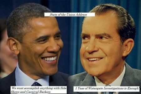 Like Nixon, who a year after Watergate Investigations but before the tide turned on him said, “One Year of Watergate is enough” at the State of the Union address of his second term, Obama exemplified the same fear about any Congressional Hearing on his eligibility by pre-depicting those who would indeed take his long form fabrication to school.