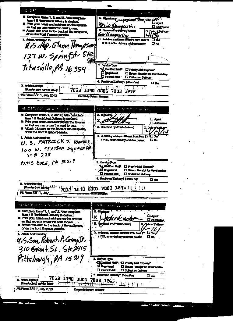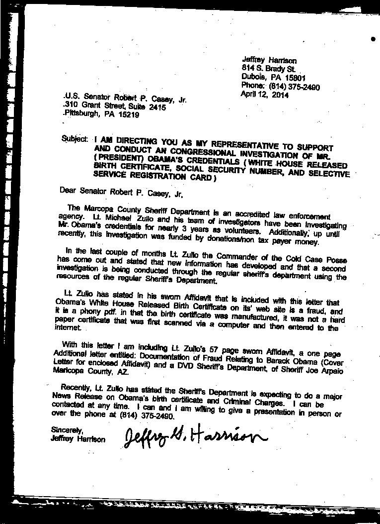 On April 12, Harrison sent letters to his U.S. congressman and two U.S. senators by priority mail with return receipt requested. Harrison had personally handed the information to one of the senators, Pat Toomey, at a townhall meeting last summer and followed up with a letter in March, to which Toomey responded with the inaccurate statement that the Hawaii Secretary of State affirmed that “Obama’s Hawaii birth certificate is genuine.” No Hawaii secretary of state, who by statute is also the lieutenant governor, has ever affirmed that anything released by the Hawaii Department of Health or the White House is “authentic.”