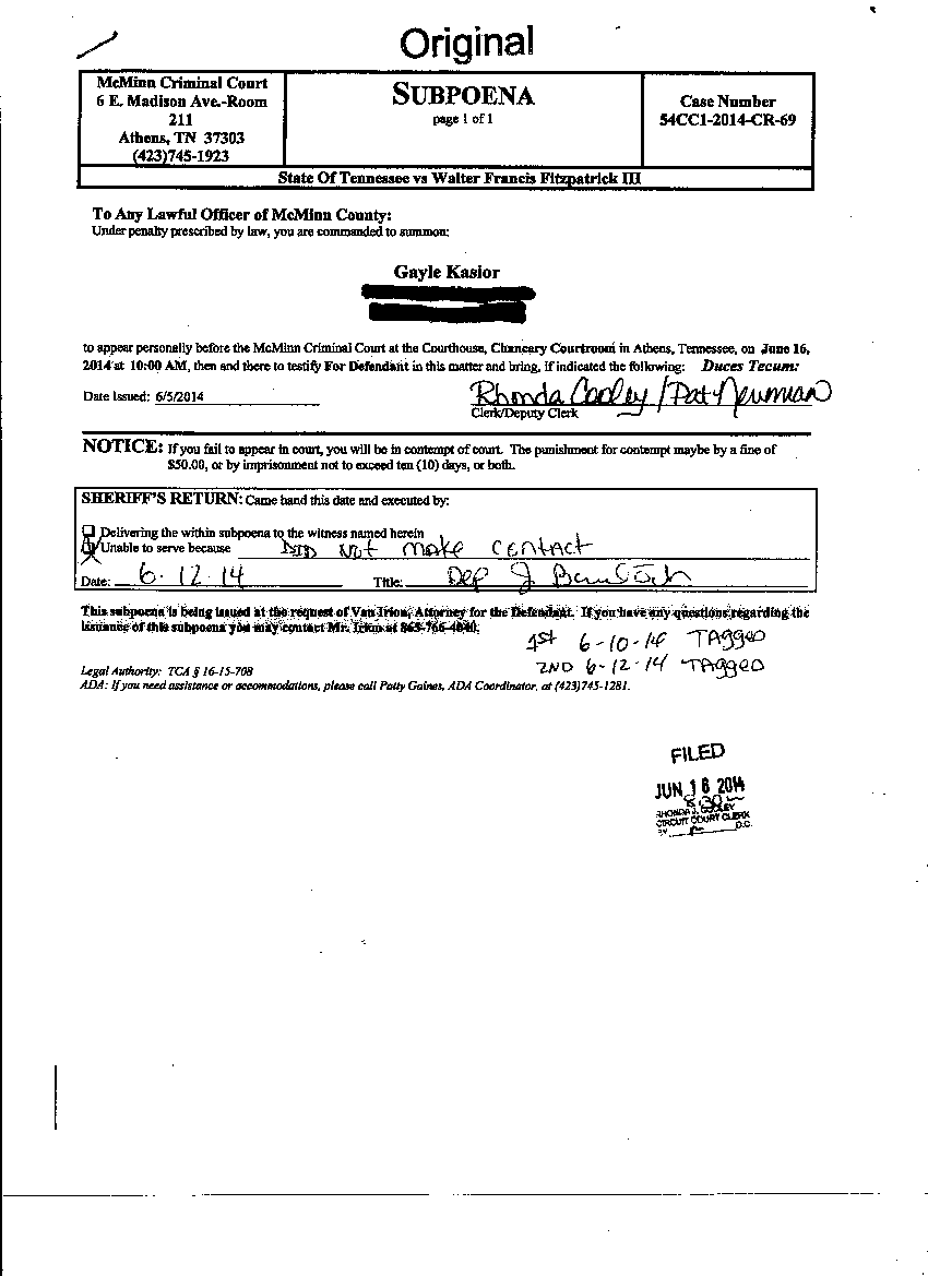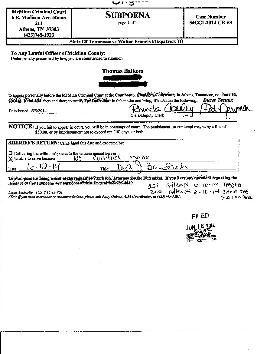 Members of the McMinn County grand jury subpoenaed for Monday said that they “did not remember” what was discussed on March 18, just before Fitzpatrick was arrested. Reedy appointed a new foreman for Fitzpatrick’s case, Thomas Balkom, who has not responded to two attempts by sheriff’s deputies to serve him with a subpoena. Similarly, Gayle Kasior has not responded to two subpoena notices left at her home.