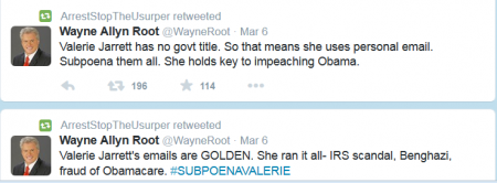 (Mar. 7, 2015) — On Twitter on March 1, former Libertarian vice-presidential candidate, former presidential candidate, author, television producer and commentator Wayne Allyn Root tweeted that White House senior adviser Valerie Jarrett “uses personal email” and “ran it all- IRS scandal, Benghazi, fraud of Obamacare…”