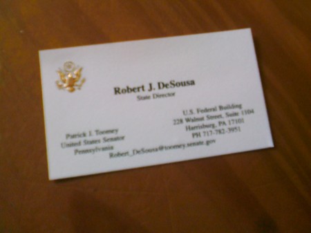 Mr. DeSousa said he would read the materials. I gave him three copies of the documentation, and I told him that this is evidence from the sheriff’s office. I told him that I was sure that I could get Lt. Zullo to call him or Sen. Toomey.
