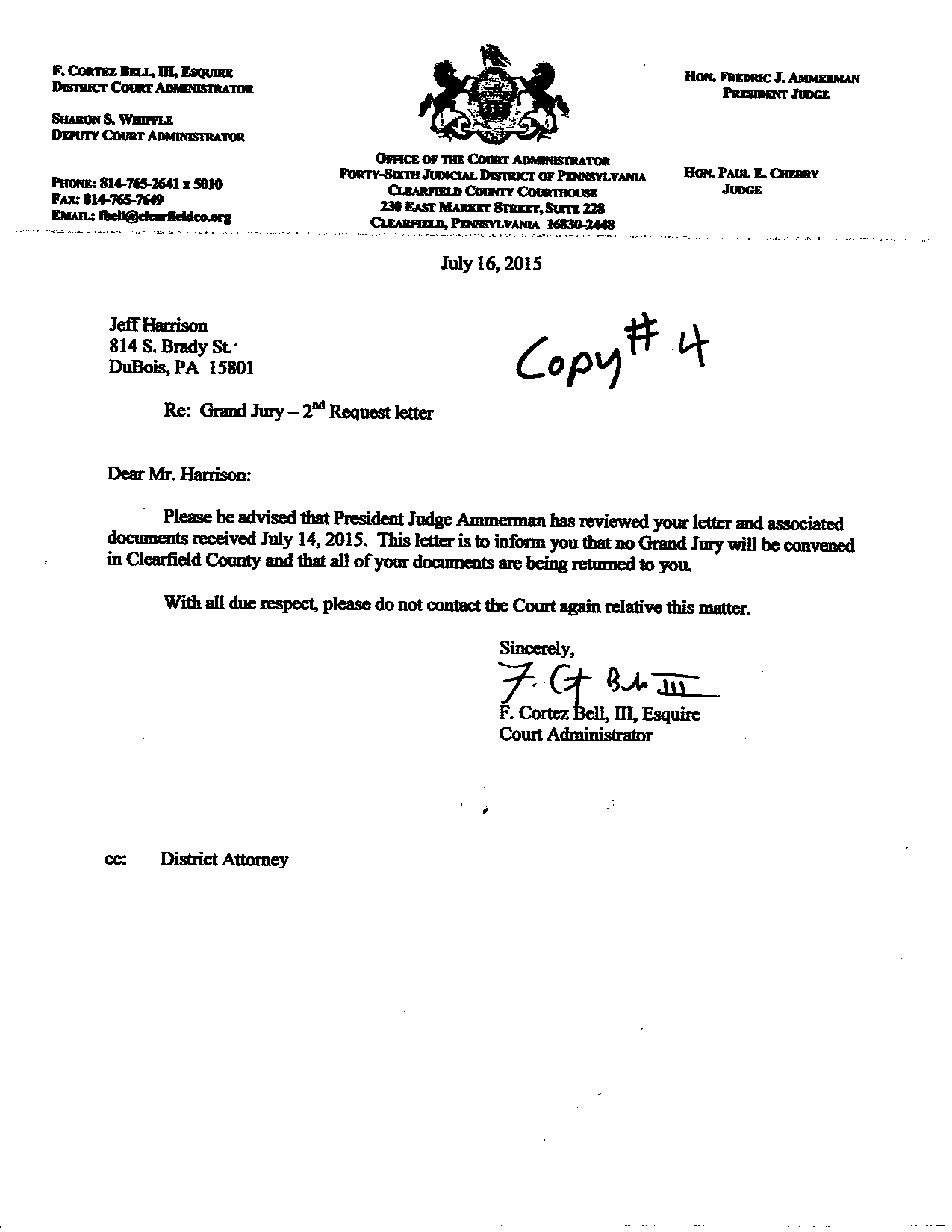 Former attorney Montgomery Blair Sibley assisted Harrison in writing to his president judge, Fredric J. Ammerman. Sibley has attempted to approach his own grand jury in Montgomery County, MD with evidence of the forgery but has been refused by an unnamed “Foreperson of the Grand Jury.”