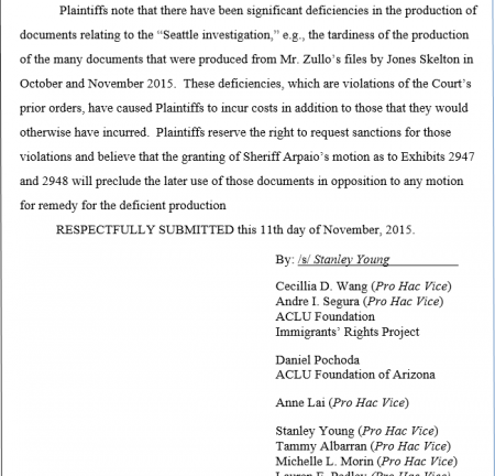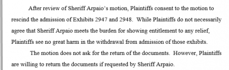 (Nov. 12, 2015) — In a filing on Wednesday, Veterans Day, attorneys for defendant Joseph M. Arpaio filed a motion in Melendres, et al v. Arpaio, et al asking the court to reverse the admission of two exhibits into evidence, claiming the communications are “privileged.”