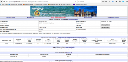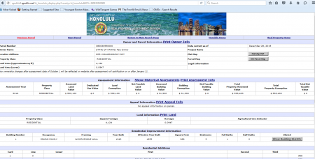 However, there are three lots in the same general area which are designated with “State of Hawaii” as owner, located by clicking the “previous parcel” link at the upper left of the screen.