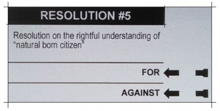At the meeting, (all figures approx.) 2,000 votes were present, either representing elected or appointed PCs present or by proxy. For the vote on the “natural born Citizen” resolution (see photo of official ballot) titled “Resolution on the Rightful (Original Natural Law) Understanding of the Meaning of U.S. Constitution Article 2, Section 1, Clause 5 “natural born Citizen,” 1500 votes were cast: 600 “FOR” and 900 “AGAINST” the resolution.