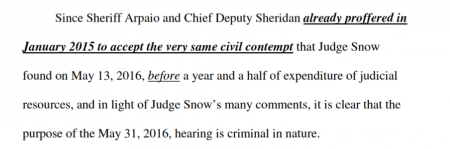 In Snow’s May 13 ruling, he announced a hearing on May 31, 2016 at 9:00 a.m. to “discuss the appropriate relief” for the Melendres plaintiffs given his declaration of contempt against Arpaio and three others. Further, Snow wrote that “It will shortly thereafter enter any applicable orders and determine if it will refer any matters for criminal contempt” (page 162).