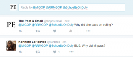 At 6:53 p.m., The Post & Email tweeted to the Michigan GOP’s statement on Twitter that the delegation would be announcing its votes, “Why did she pass on voting?”