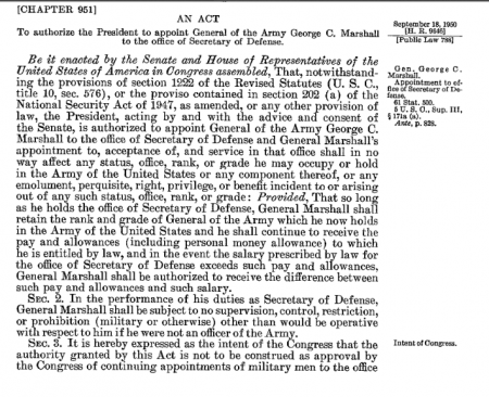 In 1950, Congress passed a statute allowing Gen. George C. Marshall (Ret), who had retired from military service in 1945 and served as Secretary of State, to serve as President Harry Truman’s Secretary of Defense. However, the statute included the following wording specific to Marshall: