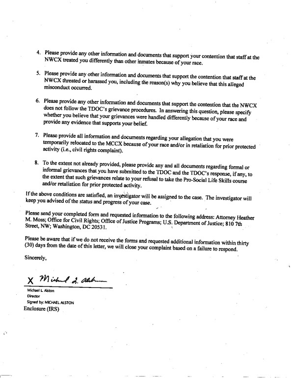 However, Alston requested “more specific information in order to investigate your remaining allegations of racial discrimination and retaliation.” Alston additionally referred to the Office of Civil Rights’ need to “disclose Mr. Johnson’s identity to the TDOC,” referring to the Tennessee Department of Correction as well as “Ms. Rondeau’s identity” in a reference to this writer’s communications sent to Alston regarding the letters and documentation we received from Johnson over a period of months.
