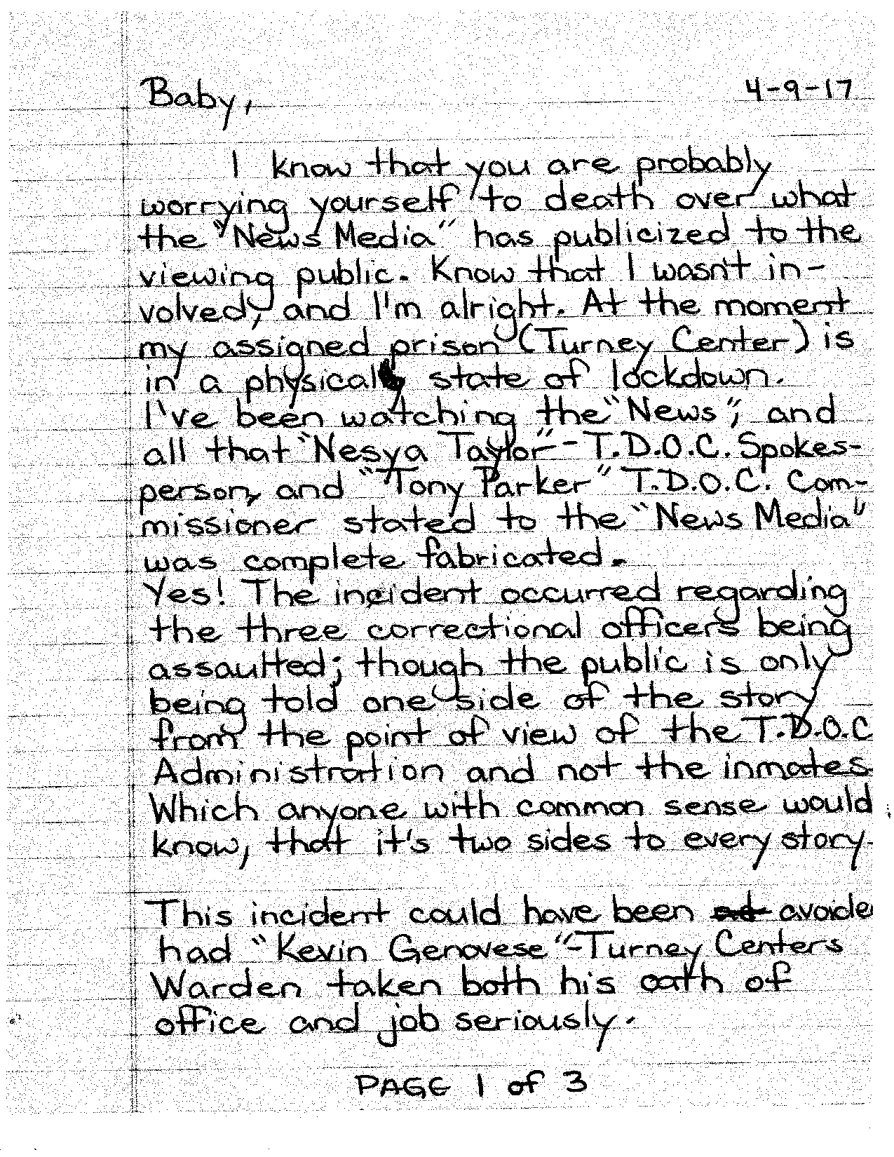 On Sunday, The Post & Email received an unsolicited email from an apparent observer to the TCIX incident who wrote, “As you know, there was, what TDOC is calling an “unprovoked incident” in Unit 3 at that prison last Sunday, April 8, 2017 that resulted in three officers being hospitalized. Attached is a letter that he sent out while the entire prison was on lock-down and no phone calls were allowed. As you will note, the story that TDOC told the media is far from what everyone, including those that were not even near Unit 3, are saying.”
