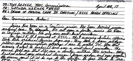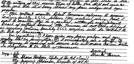 In a copy of another grievance dated April 22 received on Friday directed to TDOC Commissioner Tony Parker, Harmer reported that he has not received back the foam wedge and eyeglasses. He requested that SCCF medical director Robert Turman be replaced for allegedly having failed to ensure that the facility adheres to TDOC rules.