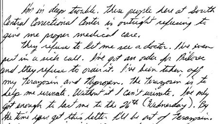 (May 1, 2017) — On Monday, The Post & Email received three letters from Tennessee state inmate Grenda Harmer, who wrote that once again he has been denied three essential prescription medications which have placed him at risk of death.