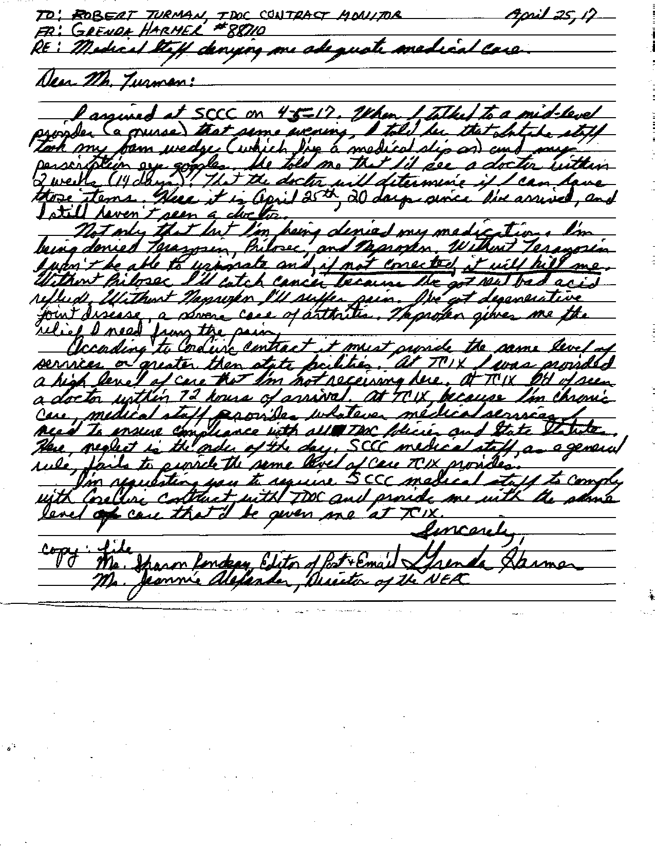 A second letter written on April 25 contained the following grievance in which Harmer wrote, “I’m being denied Terazosin, Prilosec and Naproxen. Without Terasozin, I won’t be able to urinate and, if not corrected, it will kill me.“