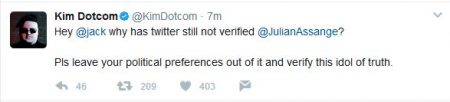 Dotcom also faulted Twitter for failing to verify a new account for Assange, who has tweeted under his own name since February and to whom Dotcom referred as an “idol of truth.”