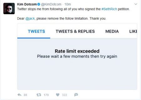 (May 25, 2017) — On Thursday at approximately 9:15 p.m. EDT, internet entrepreneur Kim Dotcom, who claims to have evidence that murdered DNC staffer Seth Rich communicated with WikiLeaks, tweeted that he was blocked “from following all of you who signed the #SethRich petition.”