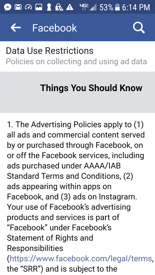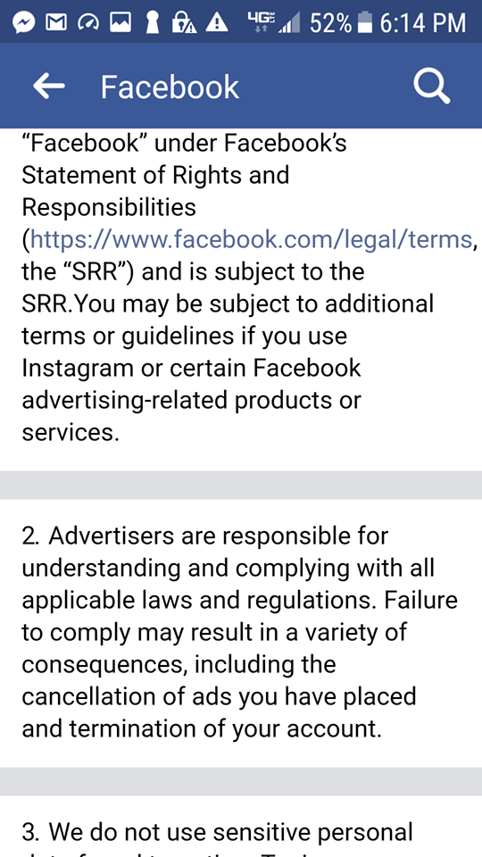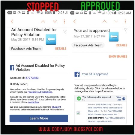 As for the process by which ads are accepted, Judy said, “It takes 15 minutes for them to consider an ad, then it’s approved or denied. Mine were both approved. The second one as we see was taken down by them for violating nothing of any particular specificity.”
