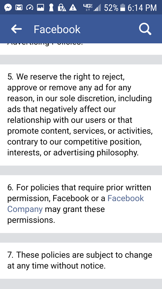 In referring to the Advertising Guidelines, Judy found that the social media giant maintains a policy whereby it can deactivate an ad for virtually any reason.