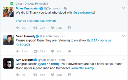 (May 30, 2017) — On Tuesday evening, internet businessman Kim Dotcom tweeted his “congratulations” to Fox News host Sean Hannity for gaining back one of the seven advertisers his show reportedly lost last week after left-leaning media outlets launched a boycott campaign.