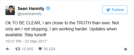 In his article, author Judd Legum made it clear that he objected to Hannity’s tweeting about the Seth Rich story, even if he ceased to report on it on television. “Since announcing that he would not discuss the Seth Rich murder any further, Hannity has continued to discuss it,” Legum complained, reproducing Hannity’s May 23 tweet to that effect.