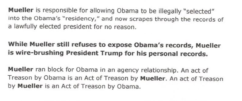 At the bottom of page 6, Fitzpatrick recounted his initial treason complaint against Obama, accusing Mueller of having “aided and abetted Barack Hussein Obama’s TREASON protecting Obama’s identity as a foreign born domestic enemy, standing guard over Obama’s sealed papers and past…” in an apparent reference to the dearth of paper documentation released by the Obama White House about its eight-year occupant.