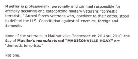 The 16-page document recounts that Mueller was FBI director during an event Fitzpatrick calls “The Madisonville Hoax,” when he and other military veterans, along with some civilians who had traveled to witness a court hearing for Fitzpatrick on April 20, 2010 in the tiny East Tennessee town, were depicted as members of a “militia” which planned to “take over the courthouse” and arrest members of law-enforcement and the judiciary.