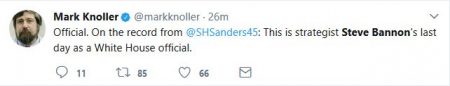 According to CBS White House correspondent Mark Knoller via White House Press Secretary Sarah Huckabee Sanders, Friday is Bannon’s “last day as a White House official.”