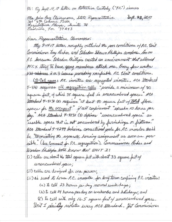 (Oct. 5, 2017) — A September 28, 2017 letter from MCCX inmate Grenda Ray Harmer to Tennessee state representative John Ray Clemmons outlines a number of alleged violations of the standards maintained by the American Correctional Association (ACA) as well as Tennessee law and official prison policies.