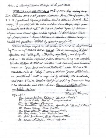 “Moreover, 41-21-201 mandates Warden Phillips to treat all inmates ‘with humanity and kindness,” Harmer wrote. “Warden Phillips is violating Tennessee law, ACA Standards, and TDOC Policies. Please investigate these verifiable claims,” the letter concluded.