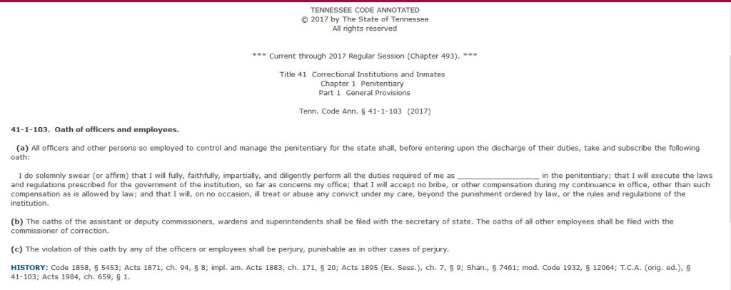 In his last paragraph, Harmer cited Tennessee Code Annotated (TCA) 41-1-103(a), which requires prison wardens to take an oath stating that they will “willfully, faithfully, impartially, and diligently perform” the responsibilities associated with their position.