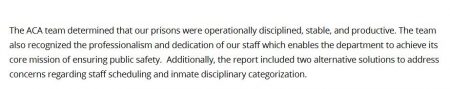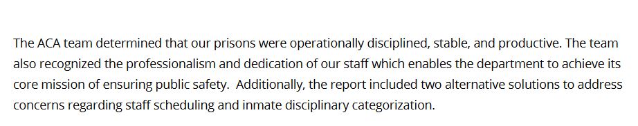 Of the October 2015 ACA inspection, the TDOC wrote that “The ACA team determined that our prisons were operationally disciplined, stable, and productive…”
