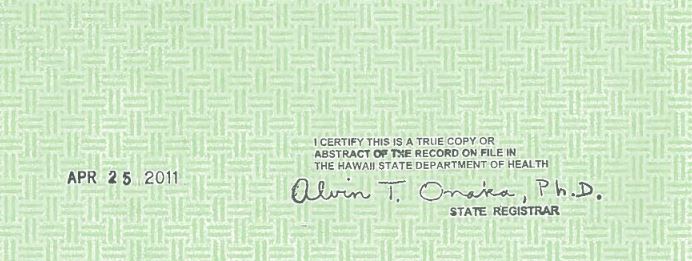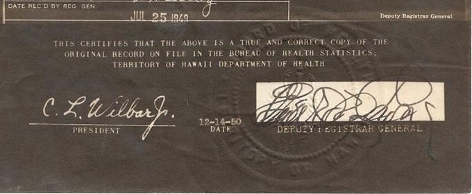 One of the images Booth provided to us for the April 14, 2011 article was that of her husband’s long-form birth certificate showing that he was born in the Territory of Hawaii on July 17, 1949. The “Date Received by Registrar General” is stamped “JUL 25 1949.”