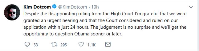 In his tweets on Wednesday, Dotcom conceded that the High Court’s decision was not unexpected but that he would continue his quest for justice, the restoration of his assets, and fight against extradition to the U.S. to face the charges.