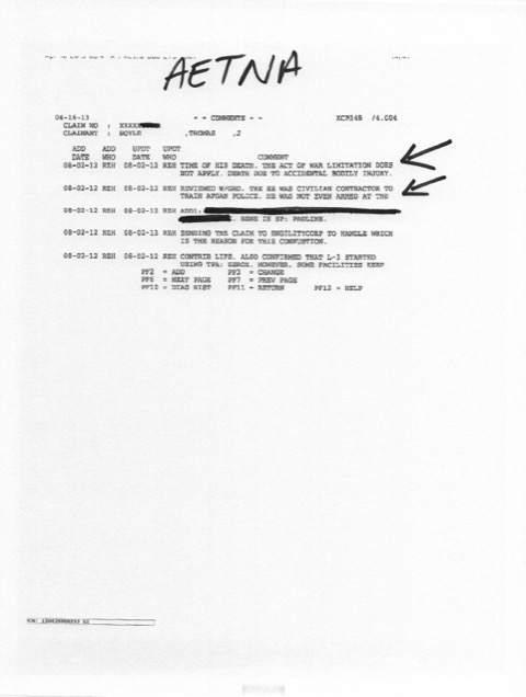 After Mr. Boyle’s death, the company-based insurance policies, underwritten by Aetna with the premiums paid by L3 Communications, were processed, and claims for accidental death policies acknowledged and disbursed not only to her, but also to L3 Communications. “I obtained, within Aetna’s own notes, references to ‘accidental bodily injury’ as the cause of death,” Mrs. Boyle told The Post & Email.