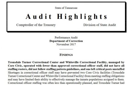 A staff shortage at the facility was noted in a November 2017 audit report completed by the Tennessee Comptroller of the Treasury. TTCC is owned and operated by CoreCivic, formerly Corrections Corporation of America (CCA).