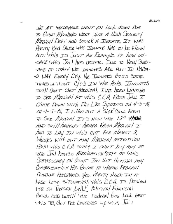He also commented on the difficulties, corroborated by many others, of obtaining medical attention. “I’ve been waiting to see Medical at this C.C.A. from Jan. I came down with flu like systems [sic] on 4-3-18, on 4-5-18, I filed out a “sick” call form to see Medical it’s now the 12th Thur, and still haven’t heard from Medical I had to lay in this cot for almost 2 weeks without any medical attention from this C.C.A.,” he wrote.