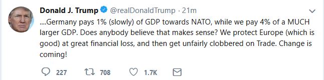 Shortly thereafter, he protested that “We protect Europe (which is good) at great financial loss, and then get unfairly clobbered on Trade. Change is coming!”