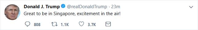His next tweet changed the subject by expressing his sense of “excitement in the air” in Singapore in the final hours before he meets with Kim Jong-Un. The summit is set for at 9:00 PM Monday night/9:00 AM Tuesday morning Singapore time.