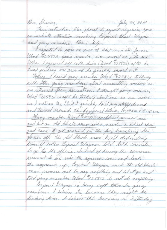 The letter continues, “The old black man tried defending himself when Corporal Wagner told both inmates to go to the office. Instead of having the cameras reviewed to see who the aggressor was and locked the aggressor up, Corporal Wagner made the old black man promise not to say anything and let it go and told gang member Wood #425812 to not do anything.”