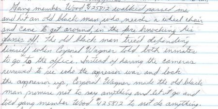 He then wrote, “Gang member Wood #425812 walked passed me and hit an old black man, who needs a wheel chair and a cane to get around, in the face knocking his glasses off.” [sic] The text was underscored for emphasis.